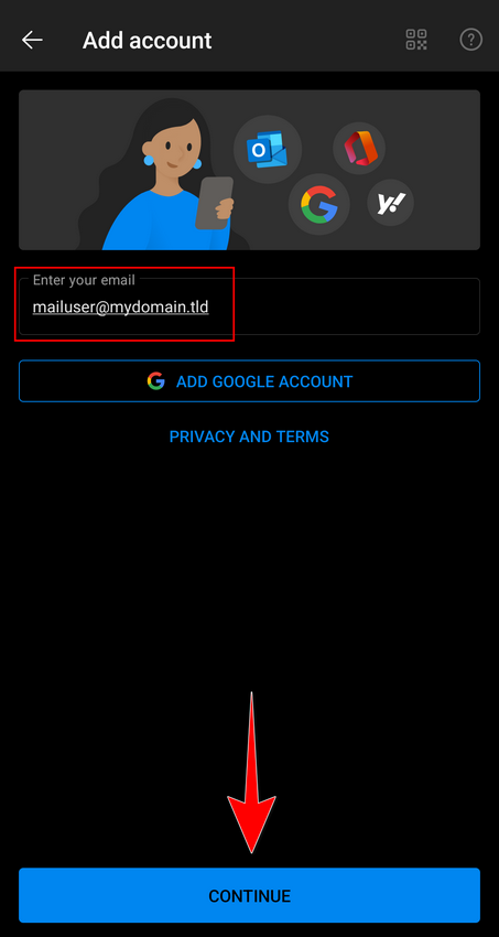 - Οδηγίες ρύθμισης Outlook app (παλιά έκδοση προγράμματος)- Πατήστε στο Get Started. Συμπληρώστε το πεδίο Email Address και πατήστε Continue. Επιλέξτε IMAP. Συμπληρώστε το Password και το Display Name που επιθυμείτε και πατήστε το check mark πάνω δεξιά και η διαδικασία ρύθμισης Outlook ολοκληρώθηκε.