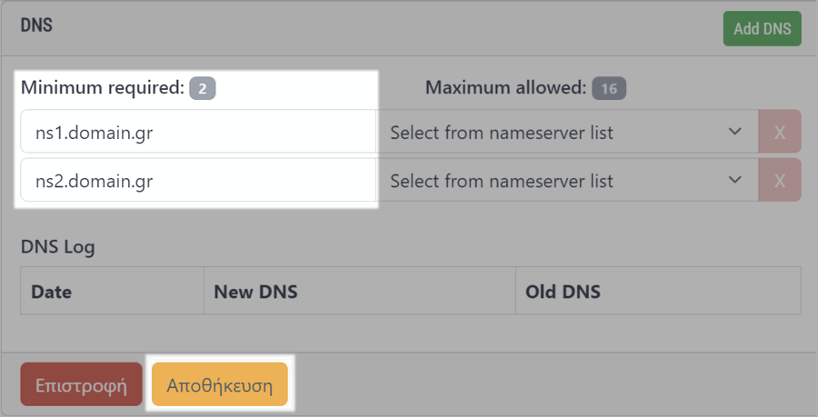 • Αλλάζετε τους nameservers σε αυτούς που επιθυμείτε και στη συνέχεια κάνετε κλικ στο κουμπί Αποθήκευση