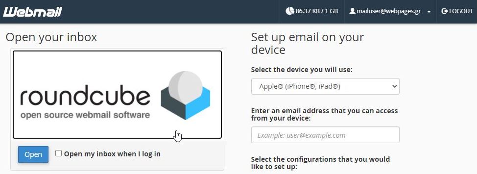 και ανοίγουμε το Webmail πατώντας στο λογότυπο "roundcube" πάνω αριστερά.