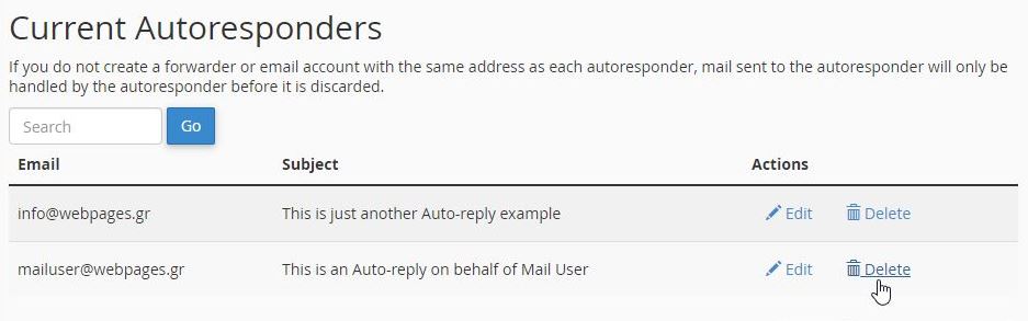 επιλέγοντας το email autoresponder που θέλετε να διαγράψετε και κάνοντας κλικ στο Delete.