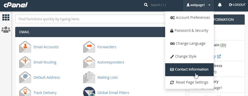 Για να αλλάξετε το email που έχει δηλωθεί στο λογαριασμό cPanel του hosting σας, πηγαίνετε στο cPanel >> Home >> Username drop-down menu