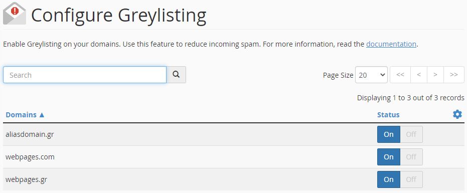 Greylisting είναι μια λειτουργία που προστατεύει τους χρήστες email από ανεπιθύμητη αλληλογραφία ή spam. Πιό συγκεκριμένα πηγαίνοντας στο cPanel >> Home >> Email >> Configure Greylisting μπορείτε να ενεργοποιήσετε ή να απενεργοποιήσετε τη λειτουργία Greylisting για κάθε domain στο λογαριασμό σας.