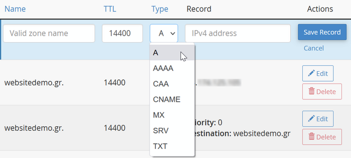 Επιλέξτε τον τύπο του record από το drop down menu της στήλης Type. Το ίδιο γίνεται και από το drop down menu του Save Record.