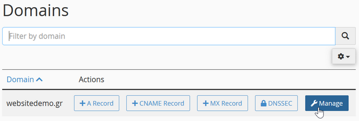 Στο search bar του cPanel πληκτρολογήστε Zone Editor και πατήστε την αντίστοιχη επιλογή. Από τη σελίδα Zone Editor μπορείτε να δημιουργήσετε και να διαχειριστείτε Records για τα domains σας. Για τη δημιουργία ενός record για ένα domain: Πατήστε ...